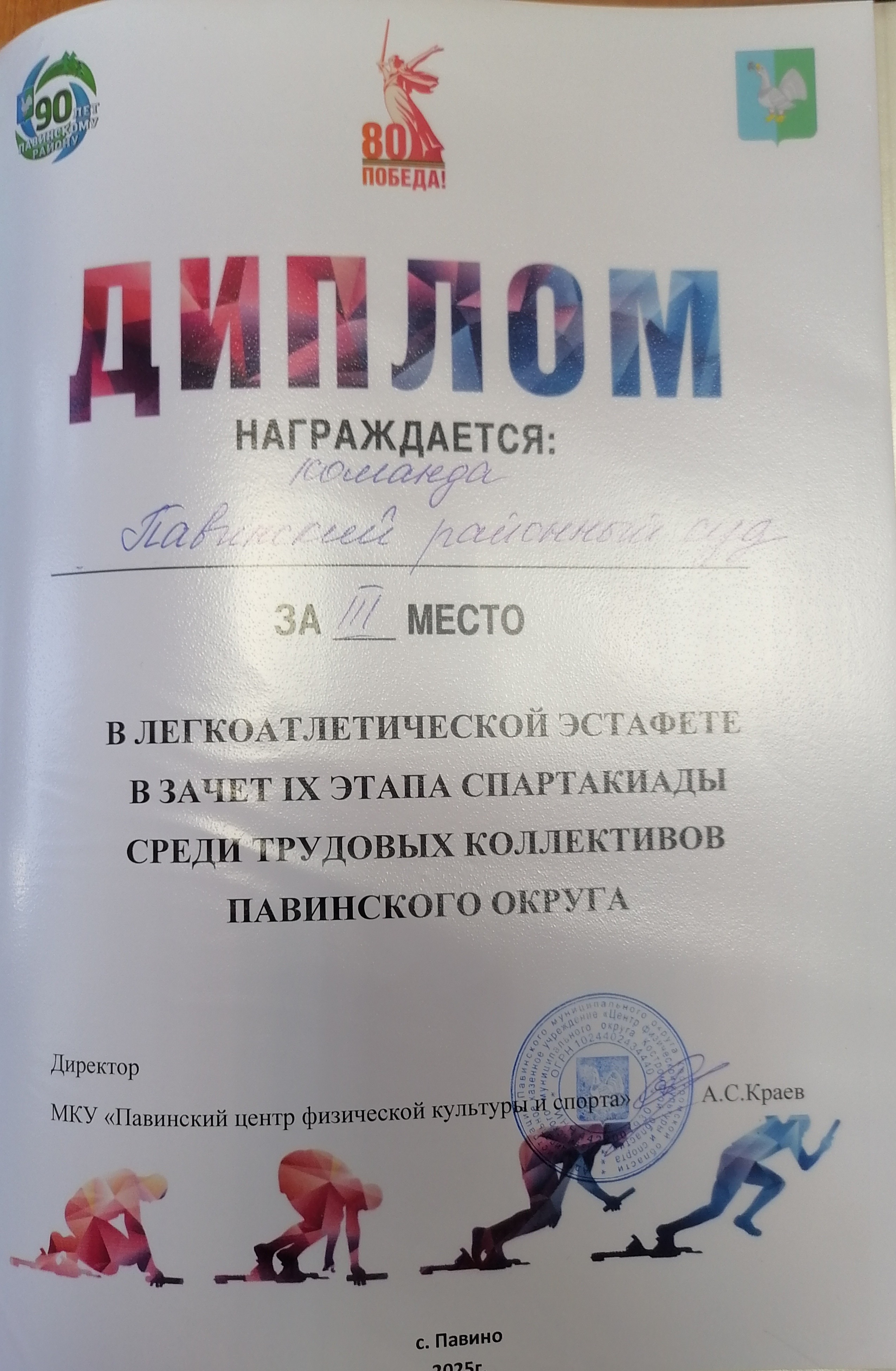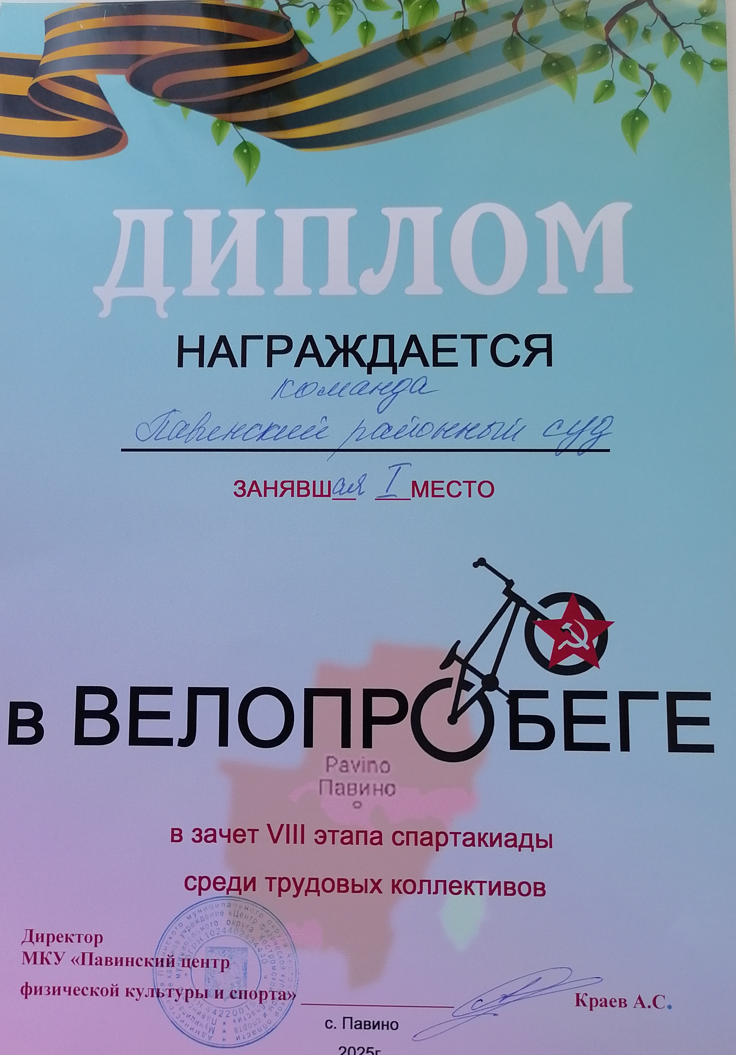 1 мая 2025 года в Павинском муниципальном округе были проведены спортивные мероприятия, посвященные 80 -летию Великой Победы и 90-летнему юбилею Павинского района. Соревнование включали в себя велопробег и легкоатлетическую эстафету среди трудовых коллективов и школьников. Среди трудовых коллективов команда Павинского районного суда заняла два призовых места: 3 место в легкоатлетической эстафете, 1 место в велопробеге. Пожелаем нашей команде дальнейших успехов в спортивных состязаниях.