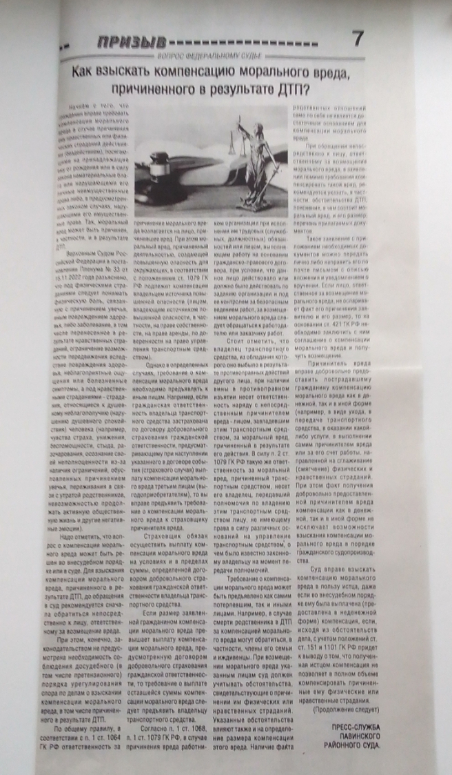 | Как взыскать компенсацию морального вреда, причиненного в результате ДТП? газета "Призыв" | версия для печати |